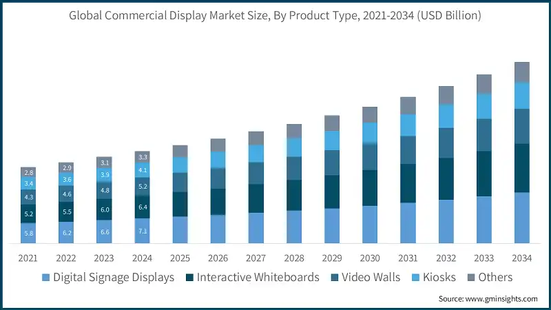 Sur la base du type de produit, le marché est divisé en écrans de signalisation numérique, tableaux blancs interactifs, murs vidéo, bornes et autres.