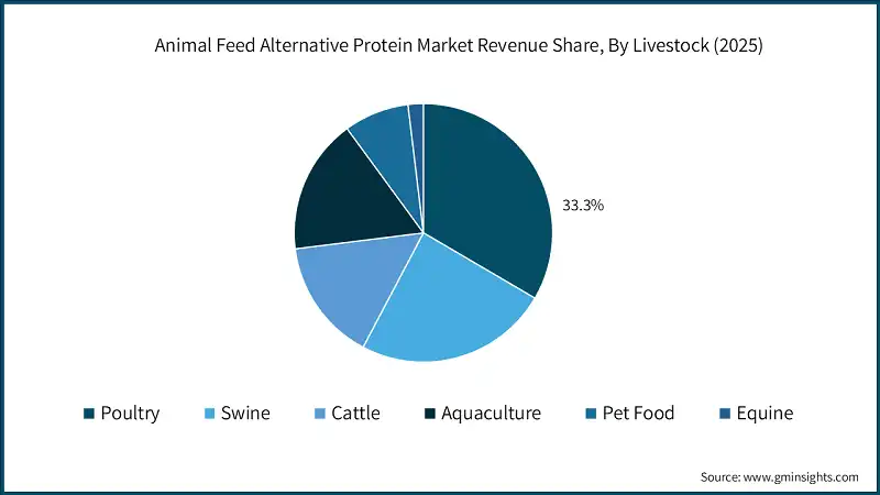 Based on Livestock, the animal feed alternative protein market is segmented into poultry, Swine, Cattle, Aquaculture, Pet food, Equine. Poultry held the largest market share of 33.3% in 2025 and is expected to grow at a CAGR of 6.8% during 2026-2035.