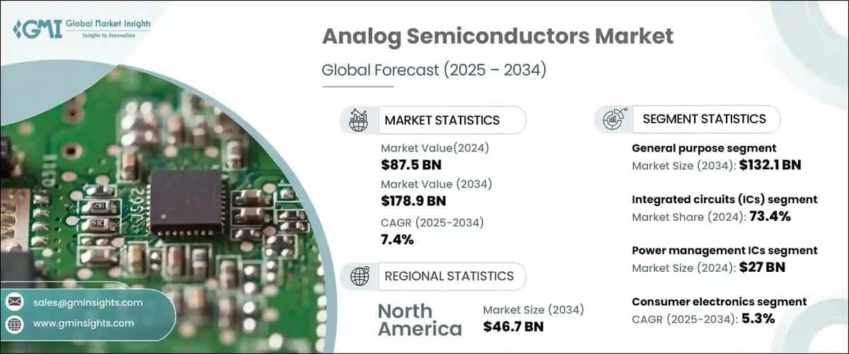The global analog semiconductors market size was valued at USD 87.5 billion in 2024 and is estimated to grow at 7.4% CAGR from 2025 to 2034. The growth of analog semiconductor market is attributed to growing demand for energy efficient devices, the growth of IoT and 5G, and increasing trend towards automotive electrification.
