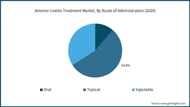 Based on route of administration, the anterior uveitis treatment market is divided into oral, topical, and injectable. The topical segment accounted for significant market share of 54.8% in 2024.