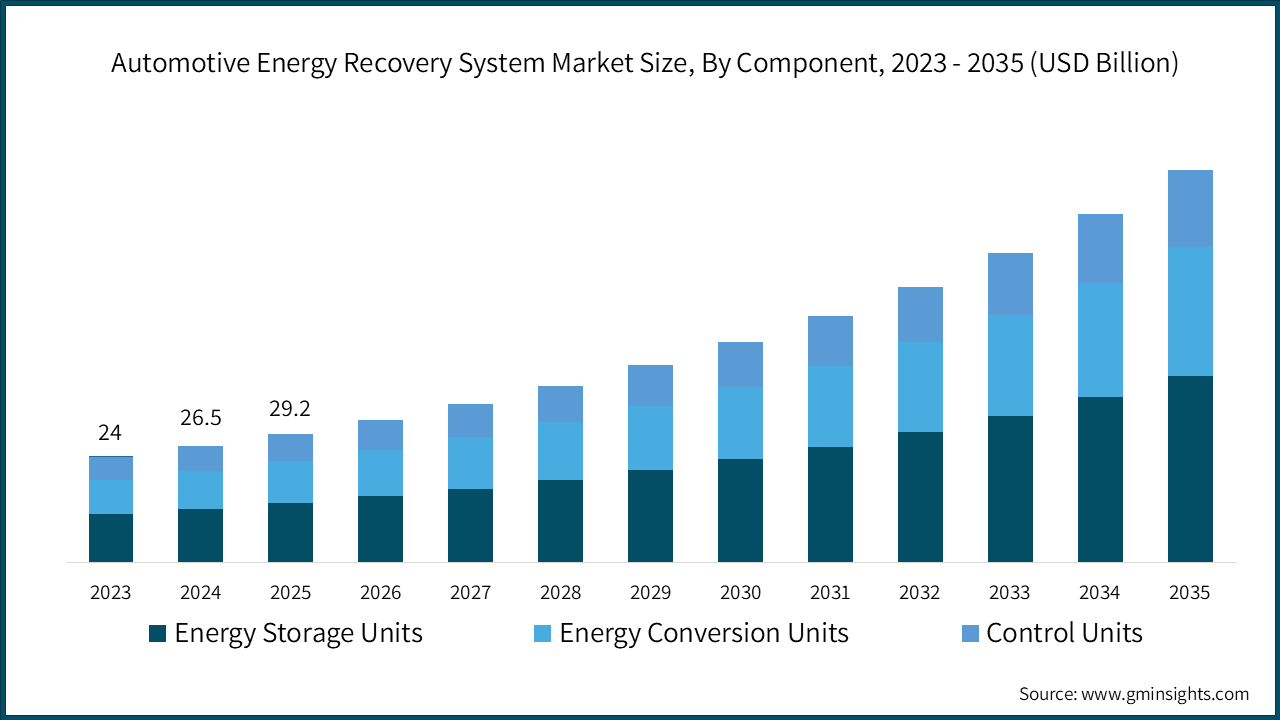 Energy storage units lead the component segment. This segment includes battery systems and energy storage devices that capture, and store recovered energy for later use, whether for propulsion, auxiliary power, or grid discharge.