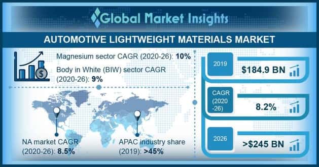 Automotive Lightweight Materials Market size surpassed USD 184.9 billion in 2019 and is projected to register a CAGR of over 8.2% between 2020 and 2026. Positive trends associated with the electric vehicle industry will create several opportunities for the automobile sector.