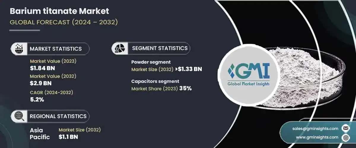 Barium Titanate Market size was valued at around USD 1.84 billion in 2023 and is anticipated to register a CAGR of over 5.2% between 2024 and 2032. Barium titanate (BaTiO3) is a ceramic material known for its exceptional dielectric, ferroelectric, and piezoelectric properties, making it pivotal in the electronics and telecommunications industries.