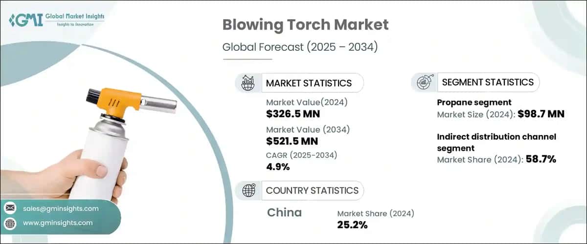 The global blowing torch market size was valued at USD 326.5 million in 2024. The market is expected to grow from USD 340.3 million in 2025 to USD 521.5 million in 2034, at a CAGR of 4.9%. In construction, blowtorches are important tools used for cutting, welding, and soldering during the building of structures. Because cities are growing and new buildings are being constructed, the demand for these tools is increasing.