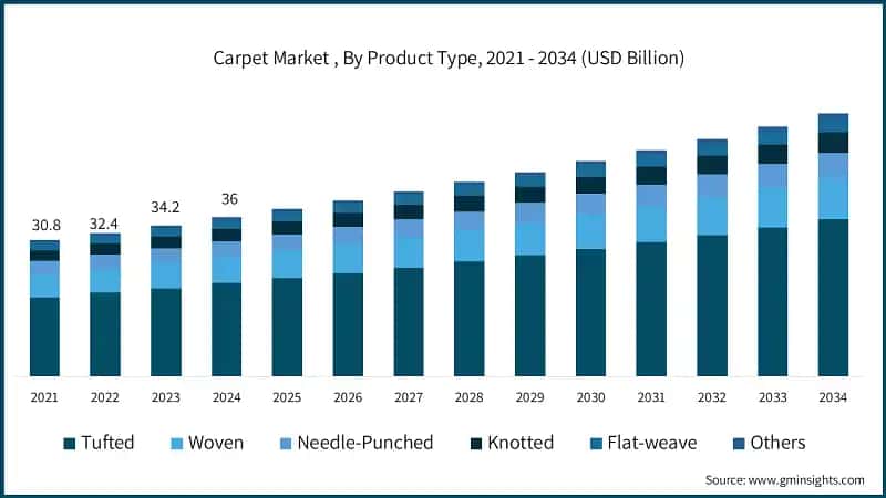 Based on type, the carpet market is divided into tufted, woven, needle-punched, knotted, flat weave, others. In 2024, tufted held the major market share, generating a revenue of USD 21.1 billion.
