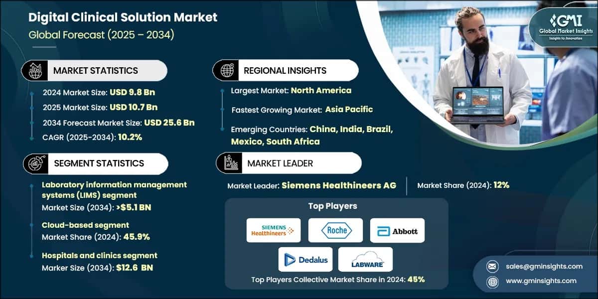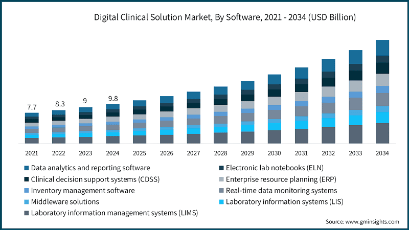 The digital clinical solutions market encompasses software, platforms, and technologies designed to streamline healthcare operations, enhance clinical workflows, and improve patient care. These solutions include tools for managing laboratory data, clinical decision support, and real-time monitoring. They enable healthcare providers, laboratories, and research institutions to optimize processes, ensure regulatory compliance, and leverage data analytics for informed decision-making.