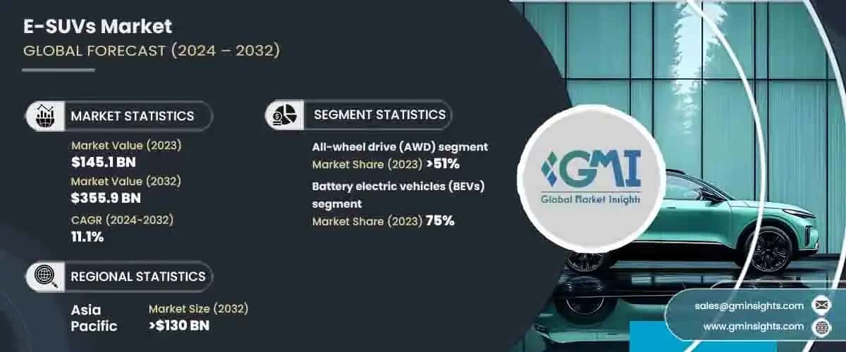 The global e-SUVs market size was valued at USD 145.1 billion in 2023 and is projected to grow at a CAGR of over 11.1% between 2024 and 2032. Increasing consumer awareness and the preference for eco-friendly vehicles are driving growth in the market. As concerns about climate change and environmental issues rise, consumers are actively seeking sustainable transportation options to reduce their carbon footprint.