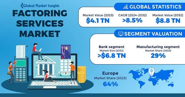 Factoring Services Market size was valued at USD 4.1 trillion in 2023 and is estimated to register a CAGR of over 8.5% between 2024 and 2032. Increasing demand for alternative financing solutions among small and medium-sized enterprises (SME) is a critical driver for the market. SME lack a lengthy and established track record, making it difficult to qualify for typical bank loans. Factoring services help SME generate rapid cash flow by acquiring accounts receivable at a reduced rate. Factoring services providers are launching innovative factoring platforms to help SME get early payments of their invoices.