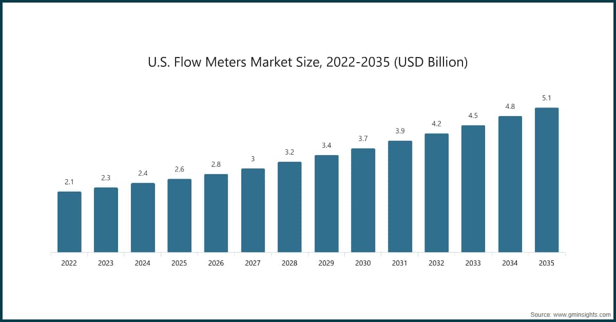 The U.S. flow meters market was valued at USD 2.1 billion and USD 2.3 billion in 2022 and 2023, respectively. The market size reached USD 2.6 billion in 2025, growing from USD 2.4 million in 2024.