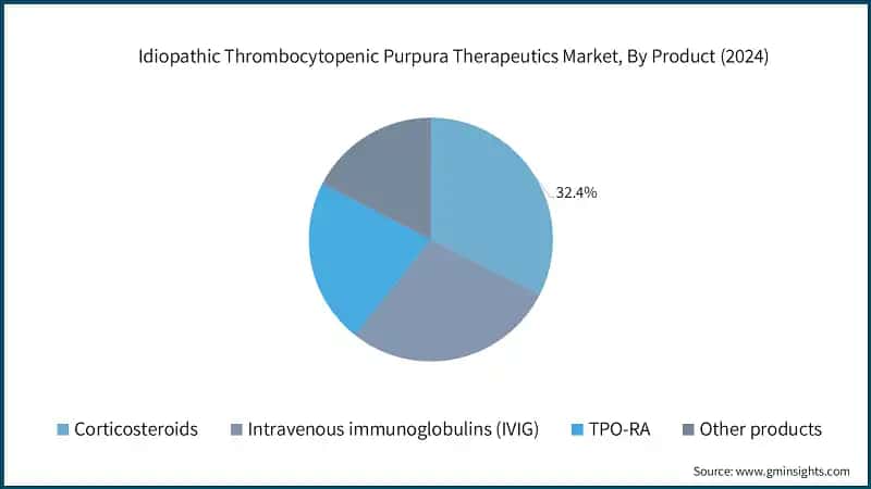 Based on the product, the global idiopathic thrombocytopenic purpura therapeutics market is categorized into corticosteroids, intravenous immunoglobulins (IVIG), thrombopoietin receptor agonists (TPO-RA), and other products. The corticosteroids segment held highest market share of 32.4% in 2024.