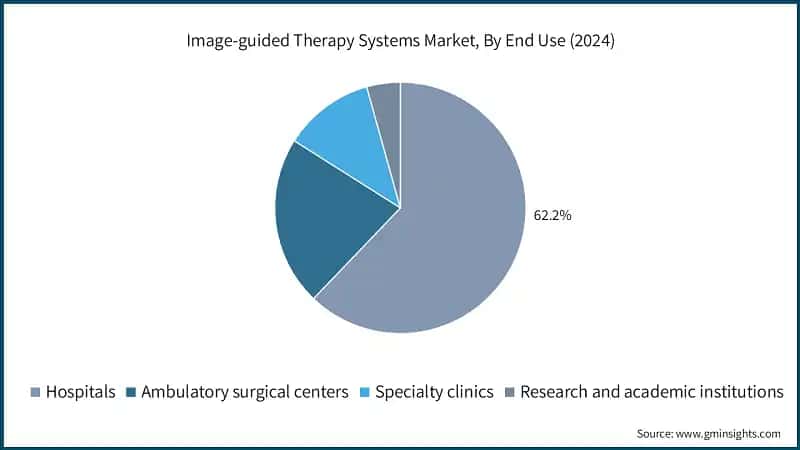 Based on end use, the image-guided therapy systems market is segmented into hospitals, ambulatory surgical centers, specialty clinics, and research and academic institutions. The hospitals segment dominated the market with a share of 62.2% in 2024.