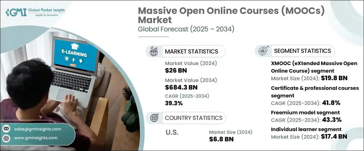 The global massive open online courses market size was valued at USD 26 billion in 2024 and is estimated to grow at 39.3% CAGR from 2025 to 2034. The growing internet penetration worldwide is a key factor for the growth of the market.