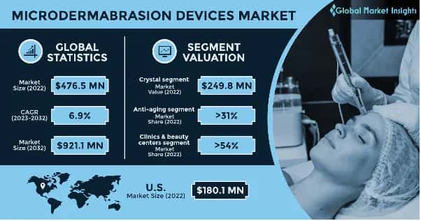Microdermabrasion Devices Market size was valued at USD 476.5 million in 2022 and is estimated to account for USD 921.1 million by 2032. Microdermabrasion devices are instruments or machines that are used in cosmetic dermatology and skincare treatments to execute the microdermabrasion technique. Microdermabrasion is a non-invasive exfoliating method that aids in the improvement of skin texture and appearance. Rising emphasis on facial aesthetics, majorly by women.