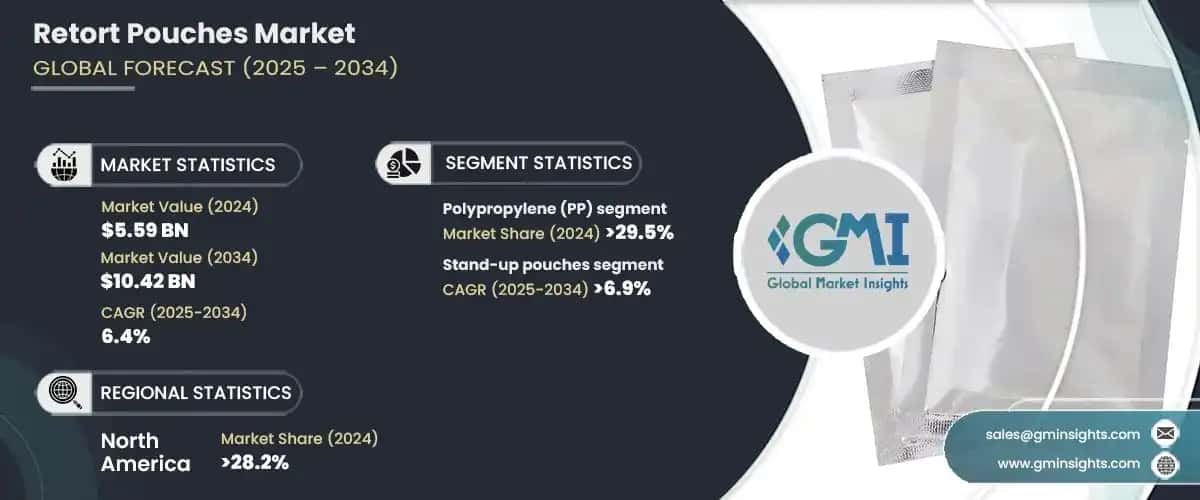 The global retort pouch market was valued at USD 5.59 billion in 2024 and is estimated to grow at a CAGR of 6.4% from 2025 to 2034. The market shows remarkable trends due to changes in consumer preferences and better environmental conscience.