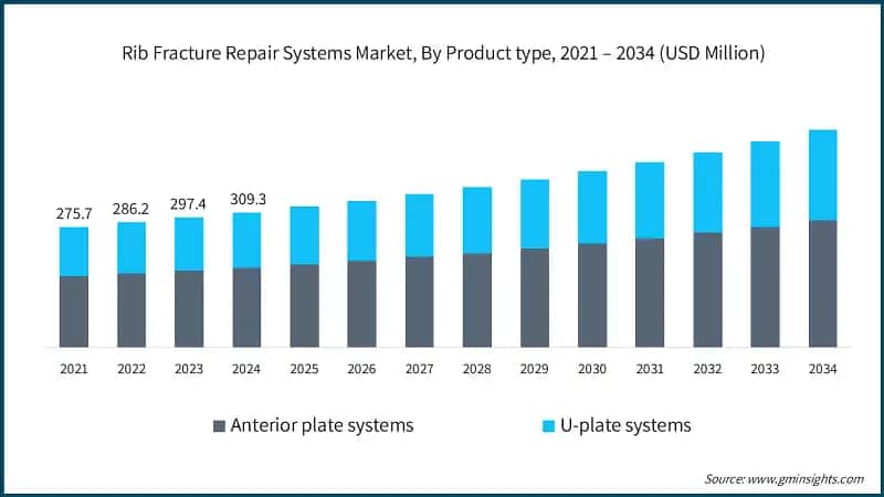 In 2021, the global rib fracture repair systems industry was valued at USD 275.7 million. The following year, it saw a slight increase to USD 286.2 million, and by 2023, the market further climbed to USD 297.4 million. Based on product type, the global market is segmented into anterior plate systems and u-plate systems. The anterior plate systems segment accounted for the highest market share and was valued at USD 183.2 million in 2024.