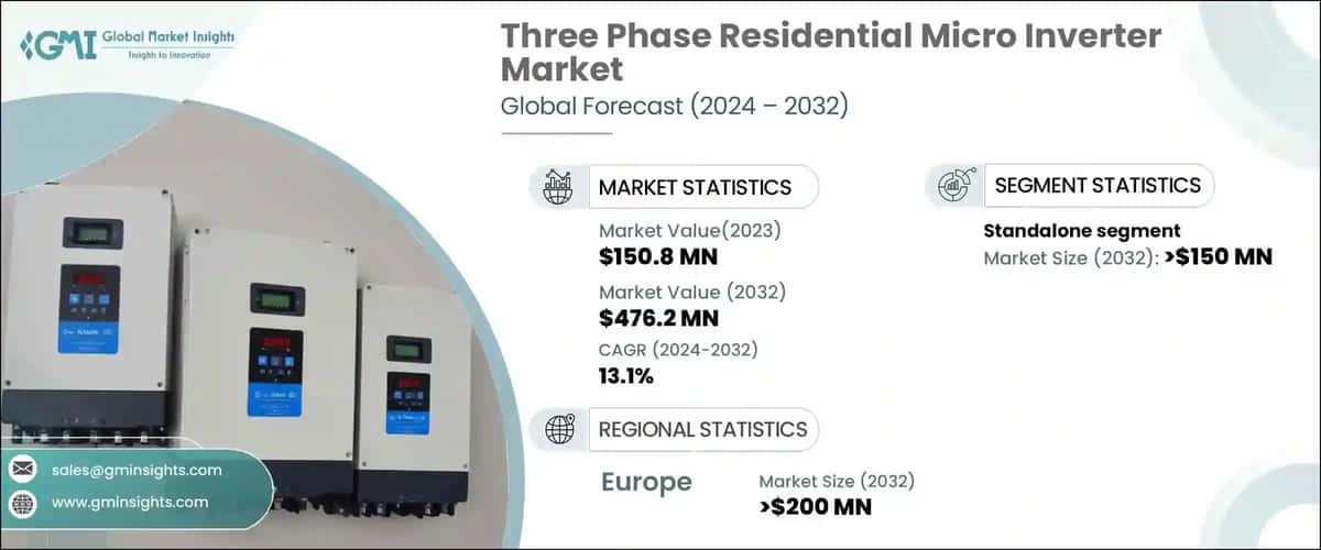 The global three phase residential micro inverter market was valued at USD 150.8 million in 2023 and is estimated to grow at a CAGR of 13.1% from 2024 to 2032. It is a compact, efficient device that converts DC generated by solar panels into AC for use in homes or for feeding back into the electrical grid. These microinverters are specifically designed to work with three phase electrical systems, which are commonly used in residential settings to provide a balanced and efficient distribution of electricity. These microinverters enhance overall system performance by maximizing energy harvest, improving monitoring capabilities, and increasing reliability, especially in scenarios where shading or varying panel orientations may occur.