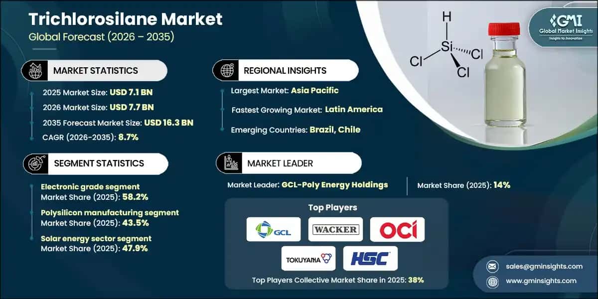 The global trichlorosilane market was valued at USD 7.1 billion in 2025. The market is expected to grow from USD 7.7 billion in 2026 to USD 16.3 billion in 2035, at a CAGR of 8.7% according to latest report published by Global Market Insights Inc.