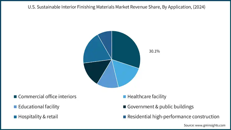 Based on application, the market is segmented into commercial office interiors, healthcare facility, educational facility, government & public buildings, hospitality & retail and residential high-performance construction. The commercial office interiors segment held around 30.1% of the market share in 2024.