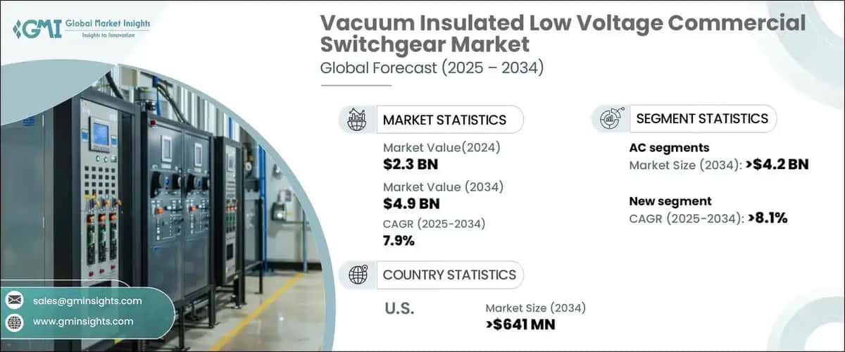 The global Vacuum Insulated low voltage commercial switchgear market was valued at USD 2.3 billion in 2024 and is estimated to grow at a CAGR of 7.9% from 2025 to 2034, due to increased demand for energy-efficient and environmentally friendly solutions is driving the adoption of vacuum-insulated switchgear, which offers reduced energy losses and eliminates the use of harmful gases like SF6. As industrial buildings and facilities focus on sustainability and energy management, vacuum-insulated systems provide a compact, reliable, and cost-effective solution for power distribution.