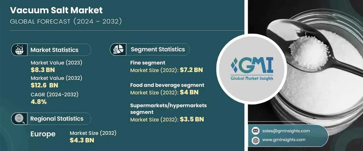 The global vacuum salt market size was valued at USD 8.3 billion in 2023 and is projected to expand at over 4.8% CAGR from 2024 to 2032. Vacuum salt, a highly purified form produced through vacuum evaporation, is widely used in food processing, pharmaceuticals, and industrial applications due to its consistent purity and granularity. The market for vacuum salt is expanding, driven by increasing demand in the food and beverage industry and water treatment sectors. According to the U.S. Geological Survey, the total domestic salt production in the United States was approximately 42 million metric tons in 2020, with vacuum pan salt contributing significantly to this output.
