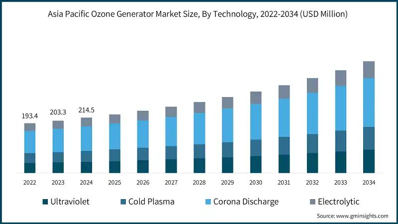 Объём рынка озонаторов в Азиатско-Тихоокеанском регионе — по технологиям (ультрафиолетовые, холодная плазма, коронный разряд, электролитические), по применению, по конечному использованию, по мощности, 2025–2034 гг.