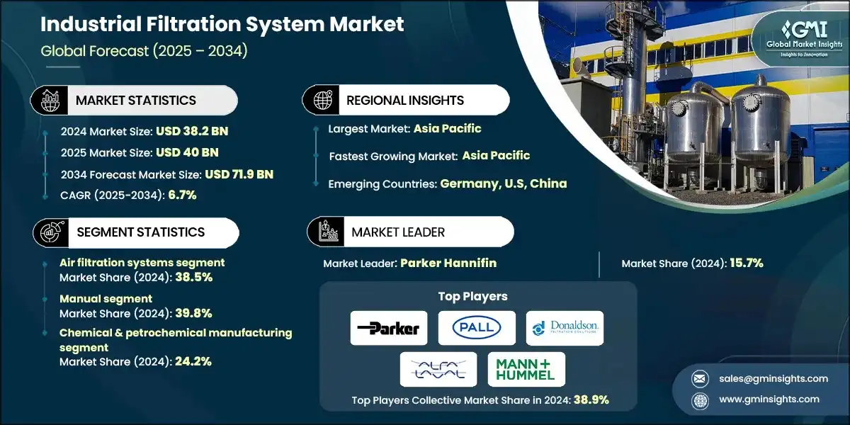 Глобальный рынок систем промышленной фильтрации оценивался в 38,2 млрд долларов США в 2024 году. Ожидается, что рынок вырастет с 40 млрд долларов США в 2025 году до 71,9 млрд долларов США в 2034 году, с темпом роста CAGR 6,7% согласно последнему отчету, опубликованному компанией Global Market Insights Inc.