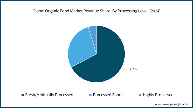 Около 67,2% продаж в органических форматах являются минимально обработанными и в значительной степени отражают предпочтения чистого состава в органической пищевой промышленности. Обработанные продукты составляют 28,1% доли рынка в 2024 году и, как ожидается, достигнут 8,9% CAGR в период с 2025 по 2034 год, балансируя эффективность в сертифицированных рынках органических продуктов. Высокообработанные виды органических форматов остаются небольшими, около 4,7% доли рынка в 2024 году, и, вероятно, достигнут около 9,3% CAGR до 2034 года по мере роста добавок, протеиновых порошков и функциональных товаров в специальных каналах на рынке органических продуктов. По сравнению с традиционными категориями, здесь можно найти более высокую терпимость к премиальным ценам, где обработка ограничена, а происхождение ясно.