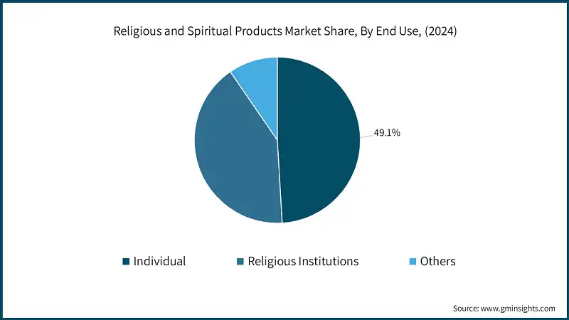 Рынок религиозной и духовной продукции по конечному потребителю сегментирован на индивидуальные, религиозные учреждения и другие. Индивидуальный сегмент был ведущим сегментом на этом рынке в 2024 году с выручкой в 2,7 млрд долларов США и долей рынка около 49,1%.